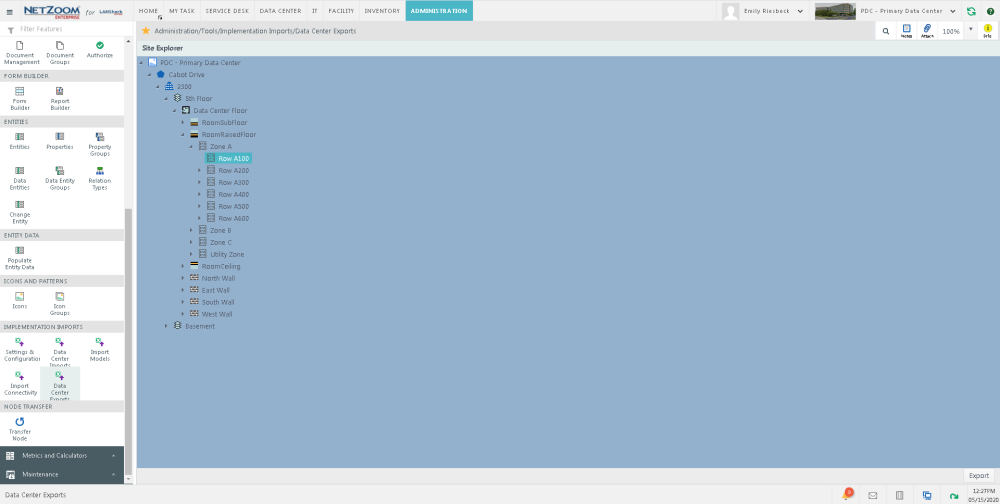 The Data Center Exports feature allows you to bulk export the hierarchy and devices of the active site from NetZoom into an Excel spreadsheet. This is useful in case you need to copy data from one site to another, or if you want to use Excel spreadsheets as a backup for the data in your DCIM solution.